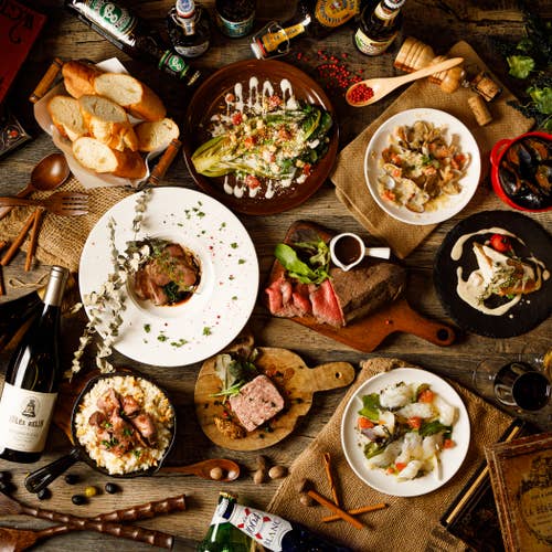 本格フレンチ、イタリアン、スペイン料理が40種類以上食べ放題、60種類以上飲み放題付き♪多くのアラカルトメニューを揃えつつ、バラエティに富んだコース料理が自慢。美味しさを追求した料理人の技が随所に光る料理が並びます。お店にはプロジェクターを設置。貸切時にはオリジナル映像...